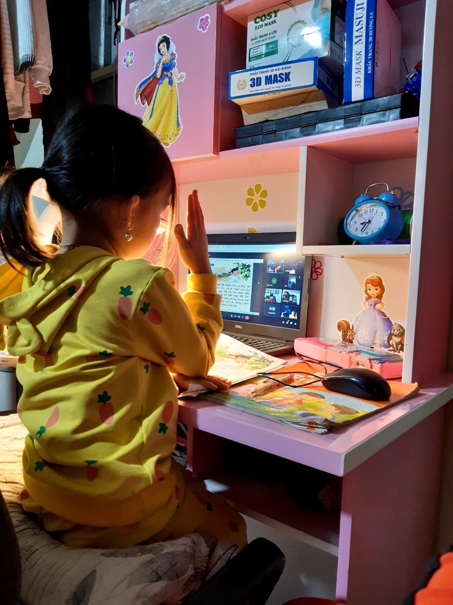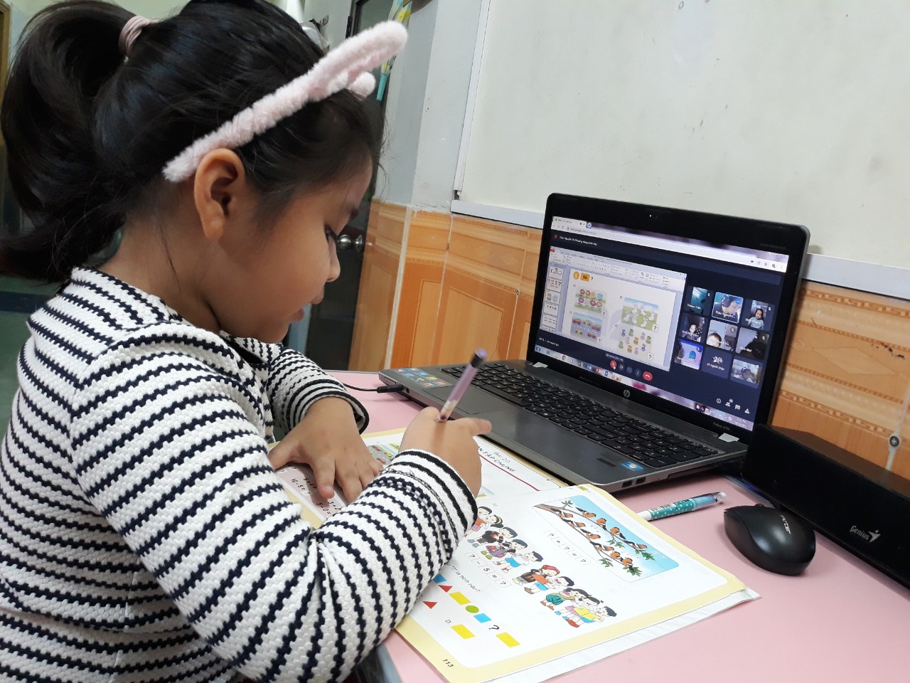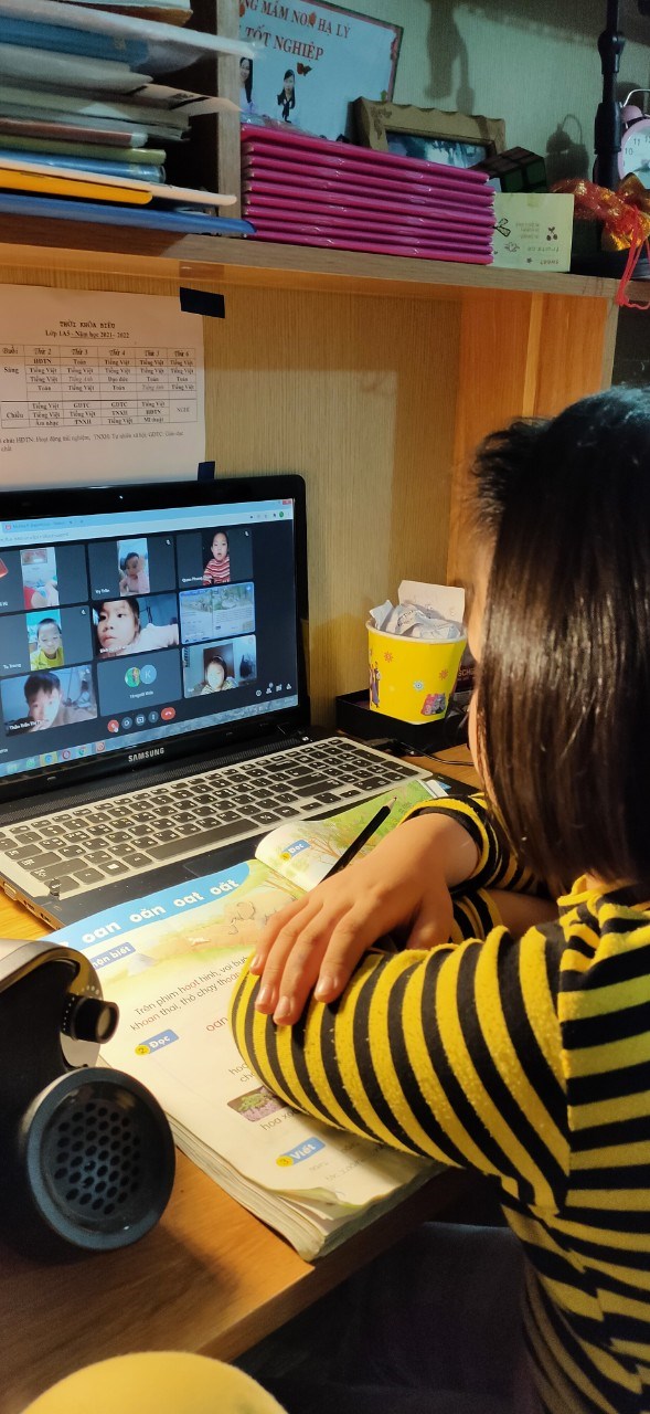 Việc học trực tuyến với đối tượng HS lớp 1 gặp không ít khó khăn cho cả cô và trò. Nhưng qua hơn một tuần triển khai học chúng tôi nhận được sự quan tâm và hỗ trợ nhiệt tình từ phía phụ huynh. Trong tất cả các buổi học phụ huynh đều ngồi kèm và nhắc nhở con em mình học. Chúng tôi ghi nhận sự nghiêm túc và hào hứng trong học tập của các em, sau đây là một số hình ảnh học trực tuyến ở nhà của các em HS lớp 1: