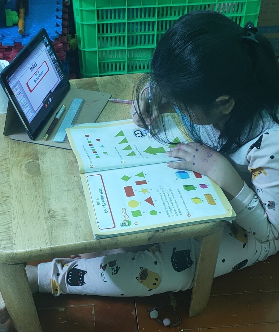 Với đặc điểm của khối 1 là các em HS còn nhỏ, chưa có khả năng tự thao tác, sử dụng các thiết bị: điện thoại, máy tính, ipad... vì thế nhà trường và GVCN khối 1 đã bố trí dạy học vào buổi tối bằng phần mềm Google Meet. Các buổi học từ thứ 2 đến thứ 6 từ 7h đến 8h30 phút.
