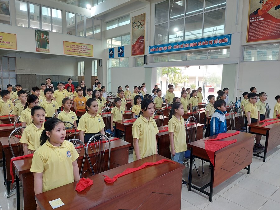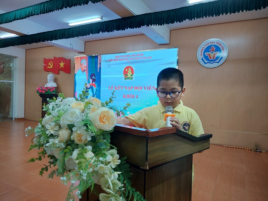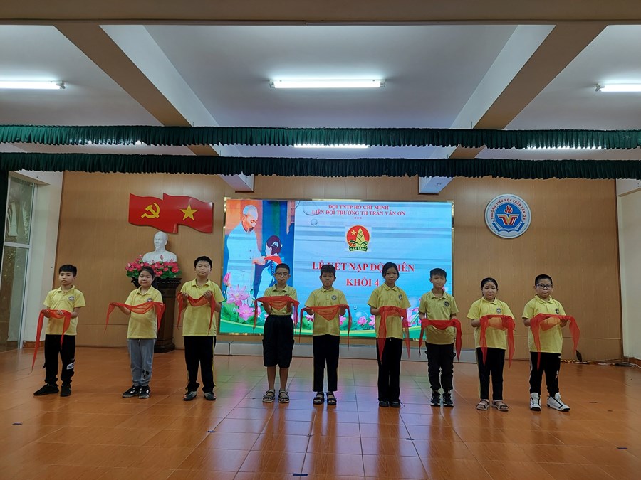 Thực hiện Chương trình công tác Đội và phong trào thiếu nhi năm học 2022- 2023, ngày 23-3-2023, khối 4 Trường Tiểu học Trần Văn Ơn tổ chức kết nạp Đội cho học sinh ưu tú của khối 4.